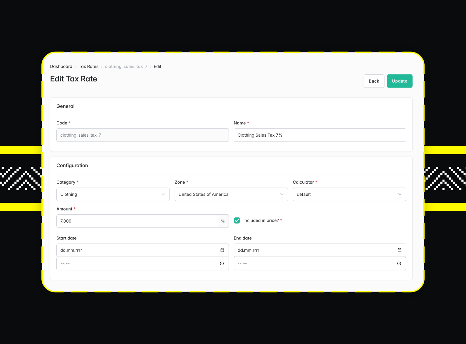 Sylius allows you to define tax categories (e.g., digital goods, apparel) and rates, then assign them to specific sales channels.