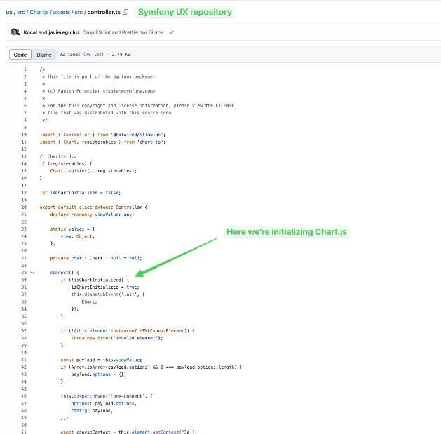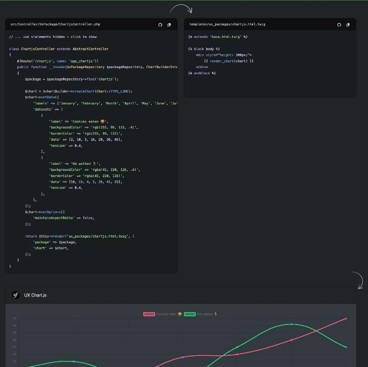 Co więcej – Symfony UX upraszcza to jeszcze bardziej. Zamiast ręcznie wpisywać data-controller=..., można użyć funkcji Twig, np. render_chart(...).